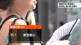 | 東京都心 過去最も遅い猛暑日に 関東甲信は大気不安定 警戒を - NHKニュース 日中の最高気温は京都府舞鶴市で37.9度、熊本市や福岡県太宰府市で37.5度、埼玉県越谷市で37.4度、名古屋市で36.4度、東京の都心や福井県敦賀市で35.1度など ...