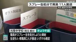 | 埼玉 越谷 中学校でスプレー缶の処分で異臭 生徒など11人搬送 - NHKニュース 【NHK】30日午前、埼玉県越谷市の中学校で、職員がスプレー缶を処分しようと噴射したところ異臭が広がり、生徒9人を含む合わせて11…